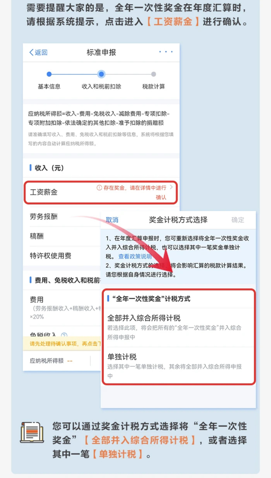 例如,对于年终奖等一次性奖金,是“全部并入综合所得计税”,还是“单独计税”,汇算的结果可能完全不同,有时可能从“退税”变成“补税”,也可能从“补税”变成“退税”,或者同样是“退税”“补税”,但金额不同。申请人可以不同计税方式都汇算一下,然后选择适合自己的方式。