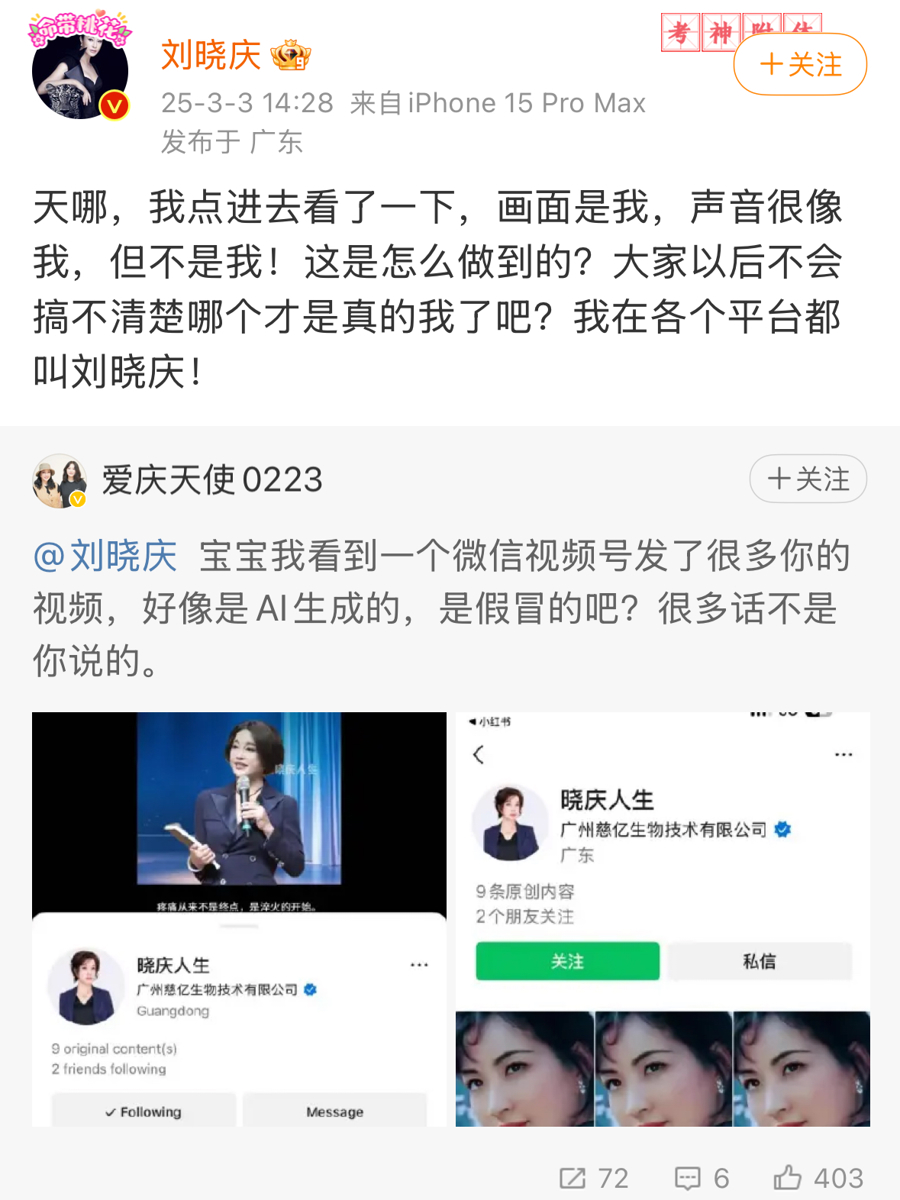 3月3日,知名演员刘晓庆通过微博澄清,微信视频号 “晓庆人生” 并非她的账号,但也承认相关账号 “画面是我,声音很像我”。