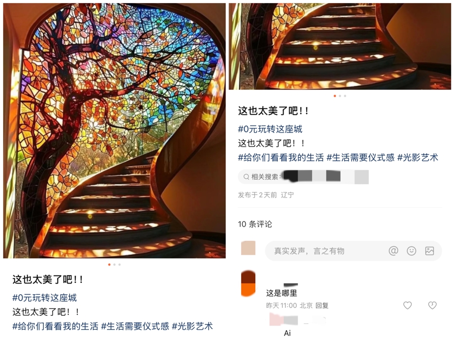 再比如,社交平台的分享等板块,美轮美奂的城市风光、鬼斧神工的自然景致撩拨着观看者的打卡之心,可当满心期待的网友向发布者追问具体坐标时,得到的往往是沉默。直至有眼尖的网友一语道破天机:这些 “照片” 大概率是 AI 虚构,发布者自然无法给出真实的地址。