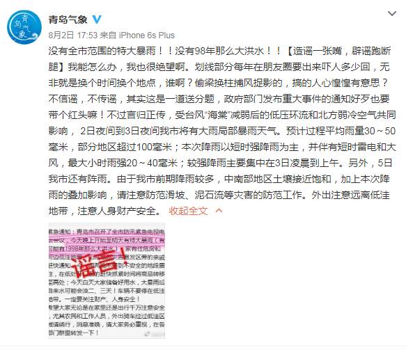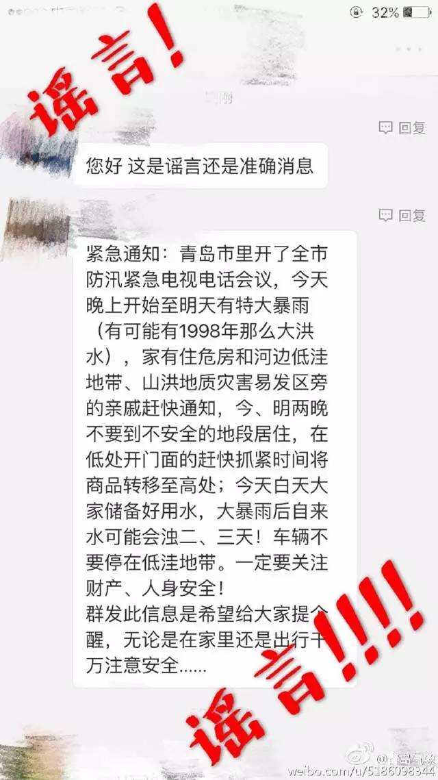 针对朋友圈传播的特大暴雨一说,“青岛气象”连发三条微博进行辟谣。其实这是去年疯传的一条假消息,今年又拿出来炒作,大家应该不信谣,不传谣。