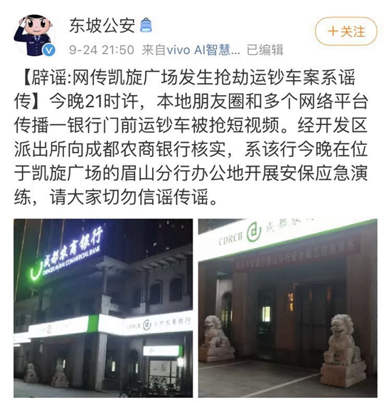 经眉山市东坡区公安分局开发区派出所向成都农商银行核实,系该行24日晚在位于凯旋广场的眉山分行办公地开展安保应急演练,请大家切勿信谣传谣。