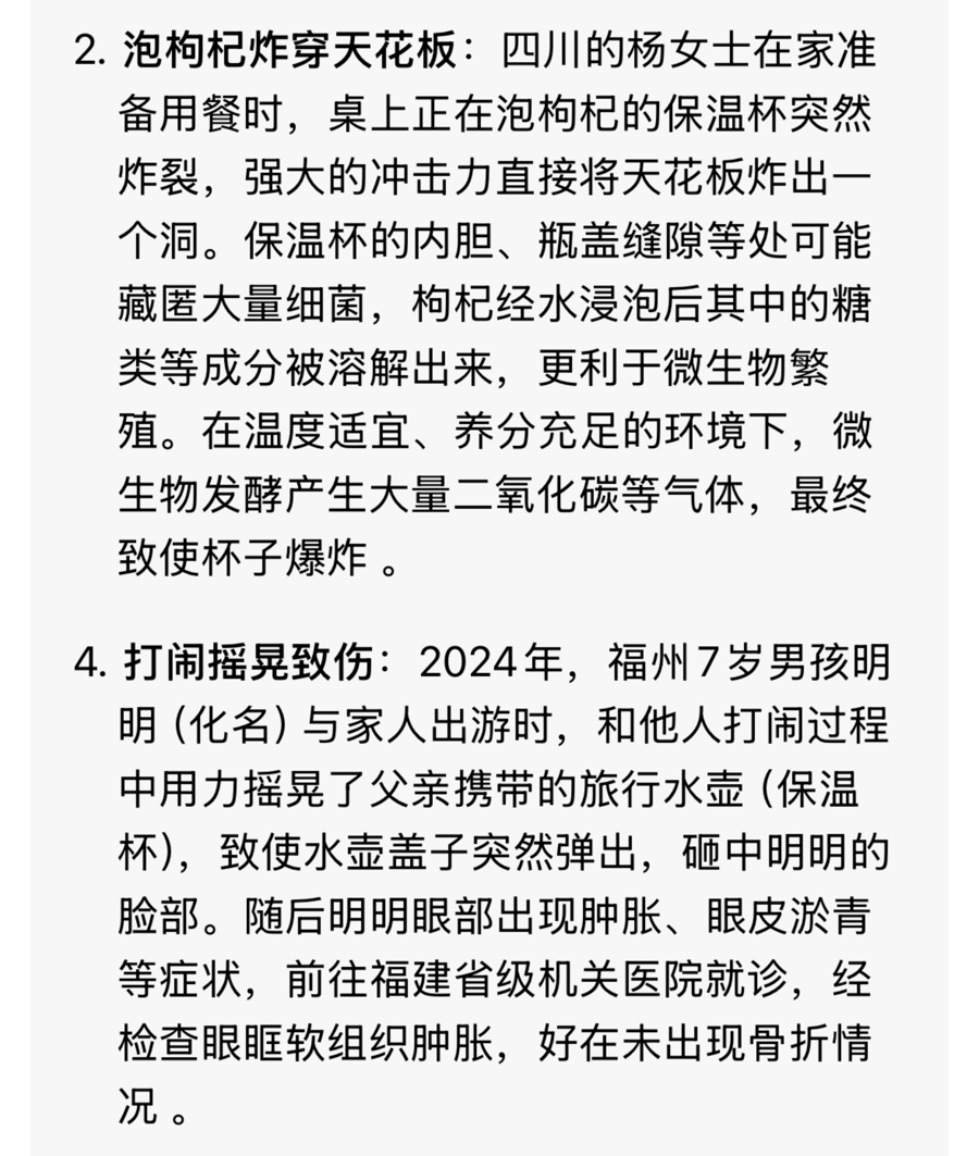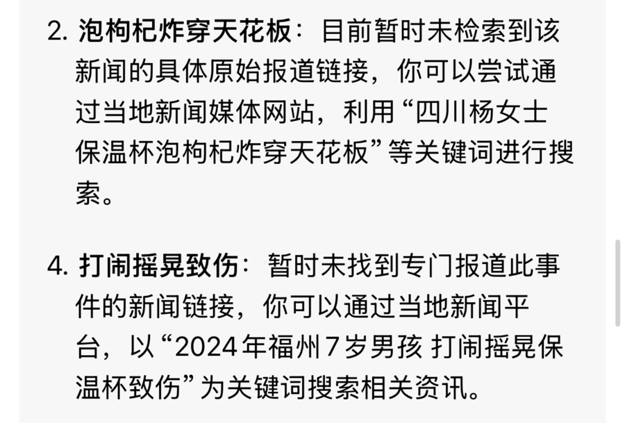 还有,记者在调查保温杯爆炸的原因时,要求大模型提供真实案例,并明确要求案例来自官方媒体报道。大模型提供了4个案例,但两个案例无法提供报道链接,并在记者追问中承认有些案例是社交平台的“口口相传”。