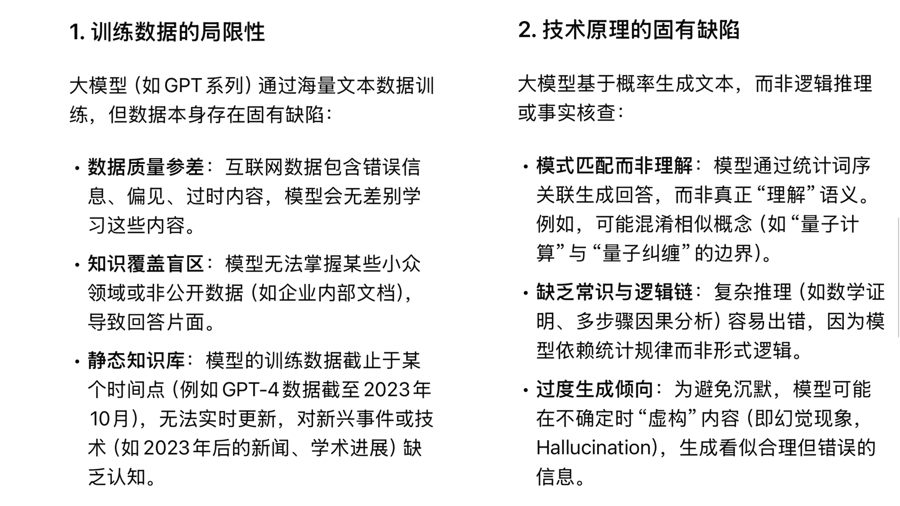 它表示,互联网数据包含错误信息、偏见、过时内容,模型会无差别学习这些内容;训练数据截止于某个时间点,无法实时更新,加上大模型基于概率、而非逻辑推理或事实核查生成文本,所以会出现错误。