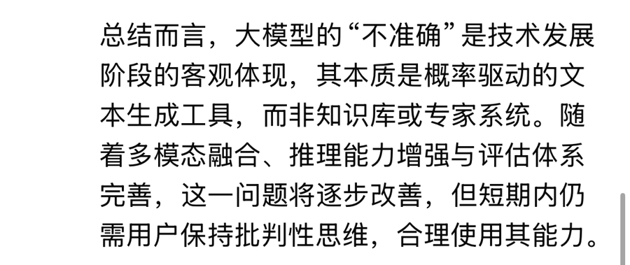基于以上现状,DeepSeek总结说:“大模型的‘不准确’……将逐步改善,但短期内仍需用户保持批判性思维,合理使用其能力。”