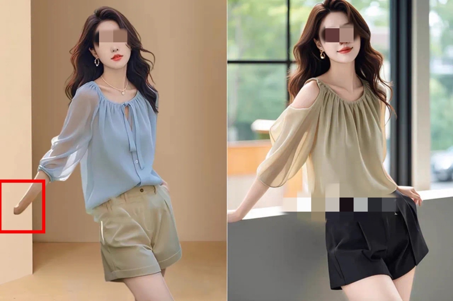 表情姿态一模一样的模特,出现了缺胳膊少腿现象。(图源:电商平台披露的AI造假图)