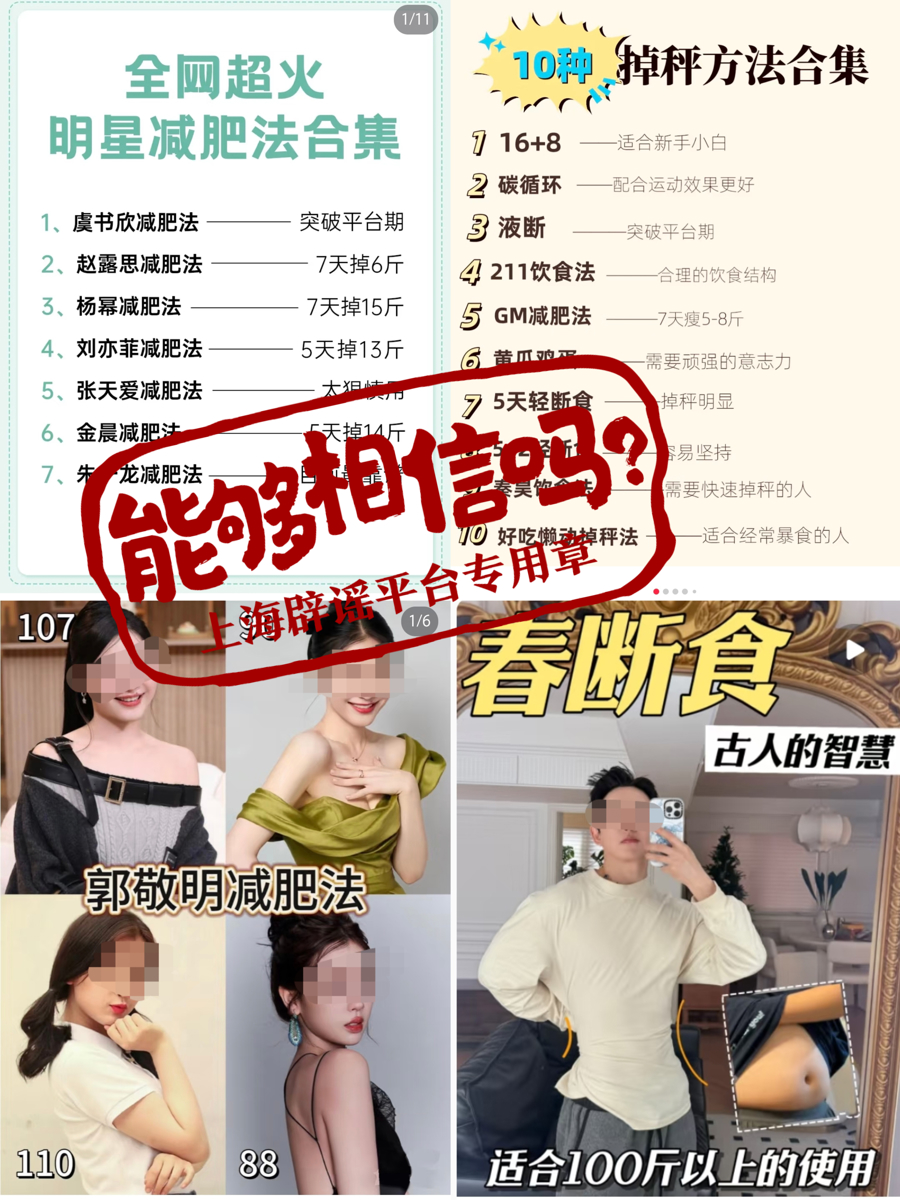 例如,“生酮饮食”“16+8间歇性断食”等原本是医学上针对特定人群的治疗方式,并不适合所有人,盲目推广给大众存在争议。而“春断食法”“xx明星减肥法”往往是建立在有争议的减肥方法上,再东拼西凑而来,更是缺乏科学性。