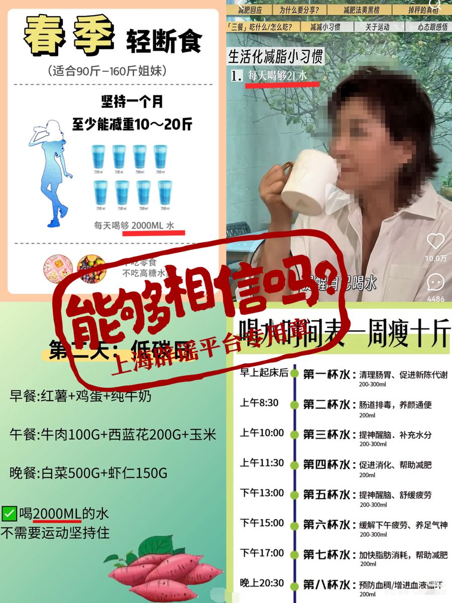 “大量喝水可以减肥”是减肥建议中最常见的做法,“每天8杯水”“每天喝2升水”“三餐前大量喝水”都是博主们最常分享的“减肥妙招”。实际上,大量喝水有可能造成身体损伤。