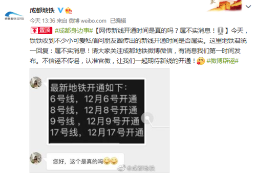 据成都轨道交通集团有限公司官方微博消息,网传“成都地铁6号线、8号线、9号线、17号线等新线,将分别于12月6号、8号、9号、17号开通”属不实消息。请广大网民关注官方信息,不信谣不传谣。\